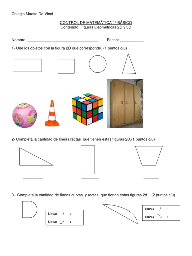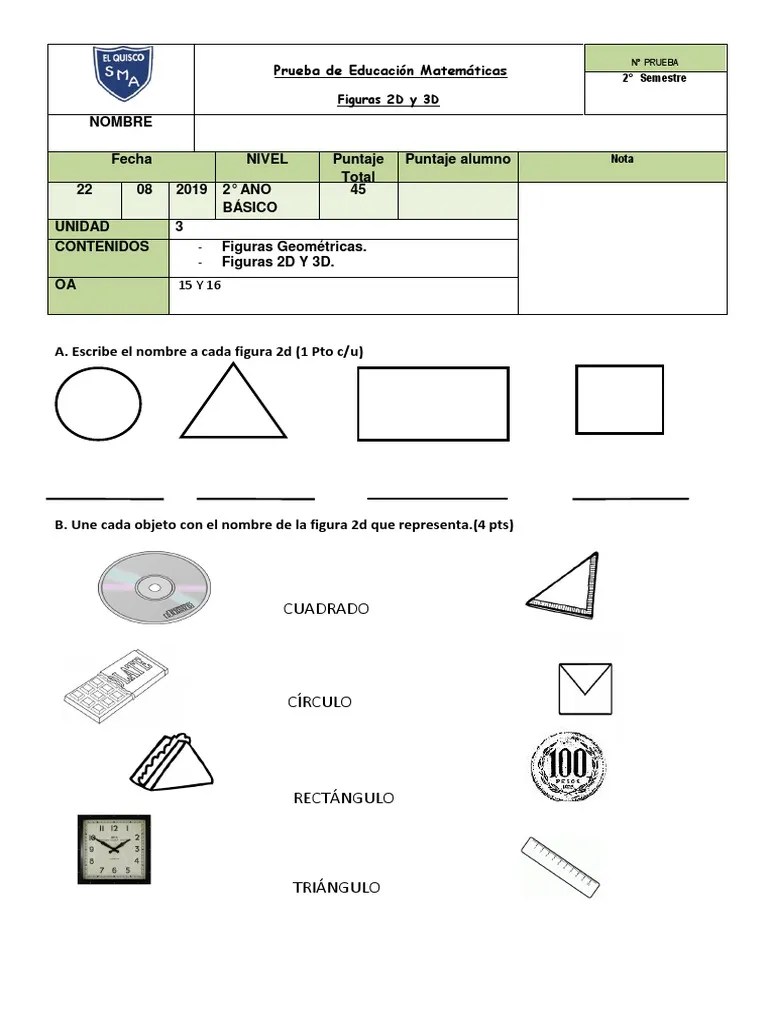 Matemática segundo básico las profesoras se han quedado con la mente en blanco, ayúdalas buscando recortes de objetos que tengan la forma que se les pide, si no encuentras recortes, puedes dibujar los objetos. Medición de objetos, usando unidades no estandarizadas. Está formada por figuras 2d que corresponden a sus caras, las. A) con una figura de 3 lados. Daniela está jugando con su juego de figuras geométricas y para terminar de armarlo se da cuenta de que le falta uno y es el que indica la flecha. Relación entre figuras 2d y figuras 3 d. Las figuras 2d son figuras planas y cerradas, es decir no tienen volumen o no ocupan un espacio. ¿con cuál de las siguientes figuras puede terminar de armarlo? Guía n°10 exploro los estudiantes de 3º básico forrarán algunas cajas y recipientes para guardar materiales. _____ una red es la representación en el plano de una figura 3d. C) con una figura de 4 ángulos rectos. Las figuras 2d son figuras planas y cerradas, es decir no tienen volumen o no ocupan un espacio.
